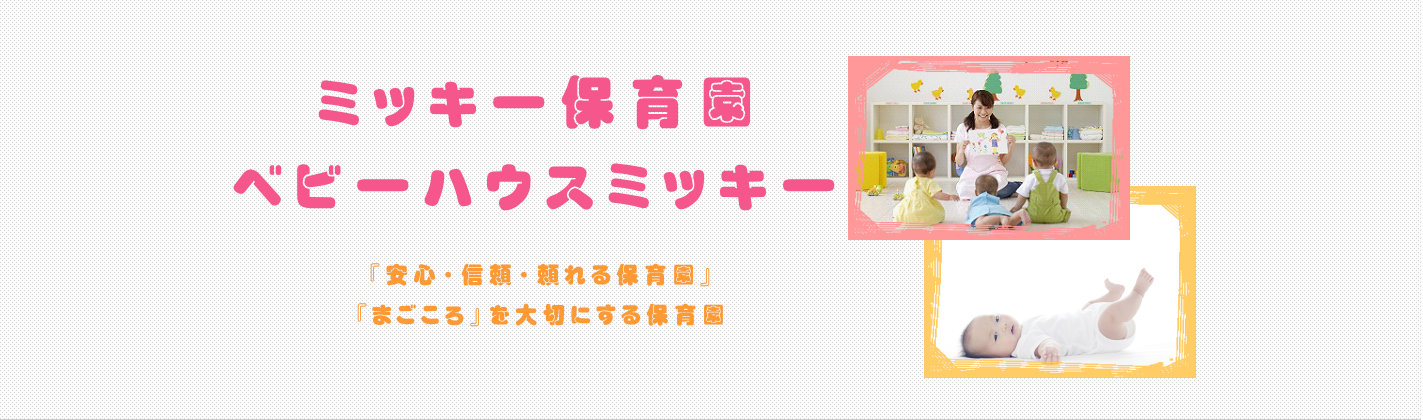 ミッキー保育園・ベビーハウスミッキーでは「まごころ」を大切にする保育園です。 ・「まぁ、いいか」の保育ではなく、「これでよし」という保育を心がけています。 ・子どもさんをお持ちの御夫婦が安心して社会に貢献、または復帰できますように、万全な体制を整え、大切にお預かりいたします。